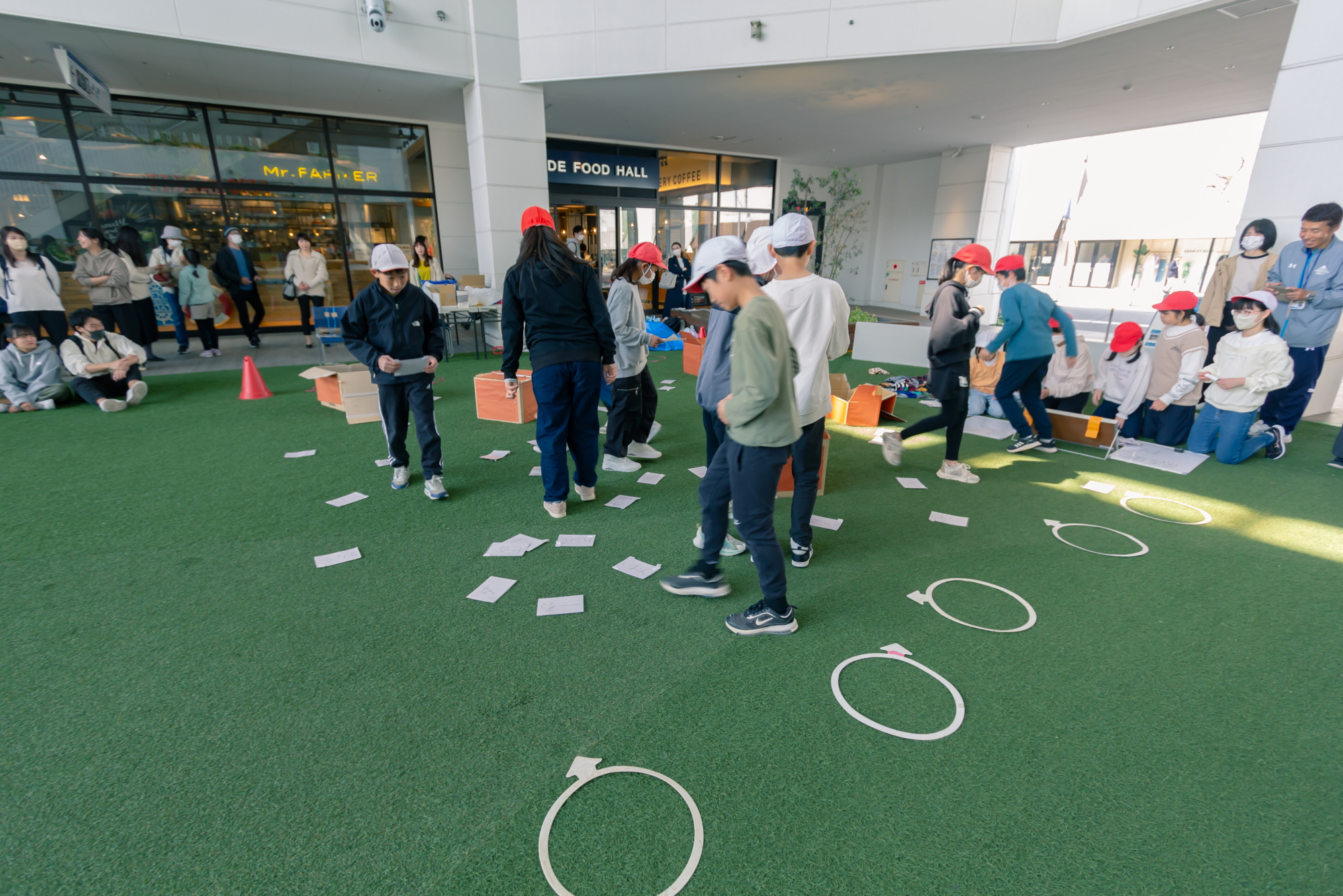 イベント当日は自分たちが考え出したゆるスポーツをグループごとに紹介した後、ゆるスポーツの体験、ゆるスポ10分運動会が行われました。自分たちが編み出したスポーツをお買い物に来た人たちにも楽しんでもらいたい! と張り切る子どもたちに姿に、大人も元気をもらえた気がします。